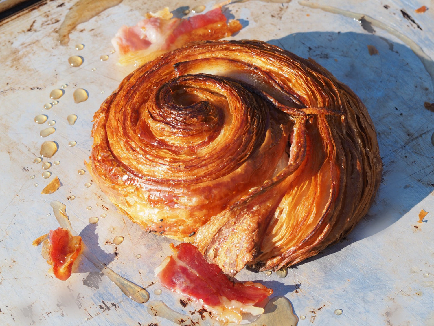 Laminated croissant dough rolled with streaky bacon, finished with a sweet maple glaze— perfect for the sweet-and-savoury lovers alike!